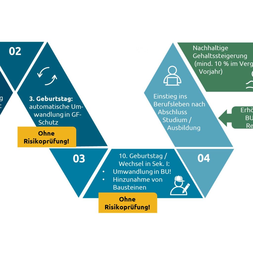 Sofern bis zum dritten Geburtstag keine Einmalzahlung geleistet wurde, wächst das Kinder-Konzept einfach mit. Ab drei Jahren wird dann ein „echter“ Grundfähigkeitsschutz daraus. Und mit Eintritt in die weiterführende Schule (ab zehn Jahren) können versicherte Kinder schließlich in die echte BU für Schüler wechseln – und das ohne erneute Risikoprüfung. Wünschen Ihre Kunden keine Änderung, läuft der Vertrag unverändert weiter. Der Schutz kann auch später noch bei vielen Ereignissen individuell angepasst werden.