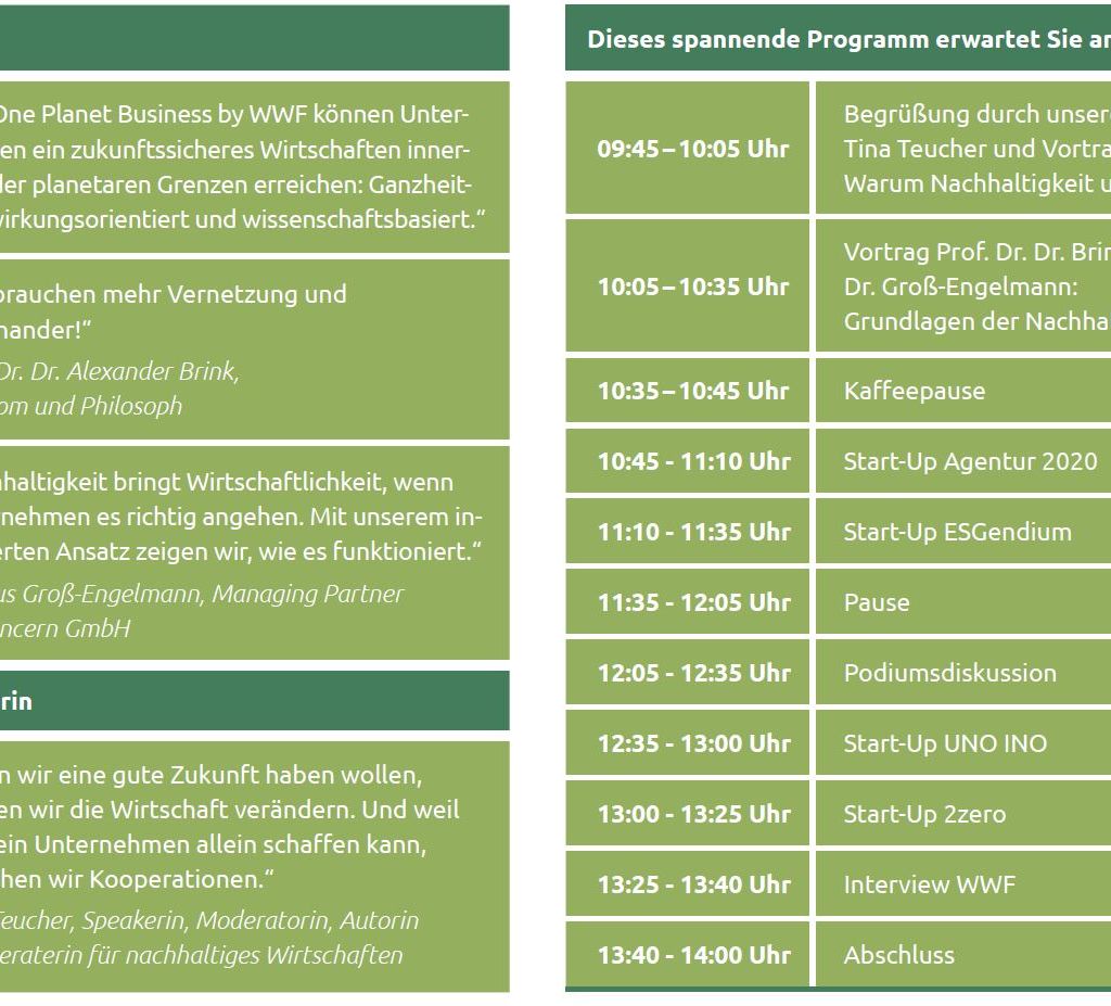 Für Ihre Firmenkunden haben wir ein ganz besonderes Online-Event konzipiert: Experten aus Forschung und Wirtschaft werden Grundlagen zum Thema Nachhaltigkeit vermitteln. Ihre Firmenkunden erhalten wertvolle Werkzeuge zur Förderung nachhaltiger Veränderungen in ihrem geschäftlichen Handeln. Fünf Unternehmen, die im Bereich Nachhaltigkeits-Beratung tätig sind, stellen sich vor. Ihre Kunden können deren Dienstleistungen im Anschluss zu Sonderkonditionen in Anspruch nehmen. Sie als Makler können die Herausforderungen Ihrer Firmenkunden besser nachvollziehen und diese dahingehend kompetent beraten – und bei Ihren Kunden durch dieses Angebot punkten!