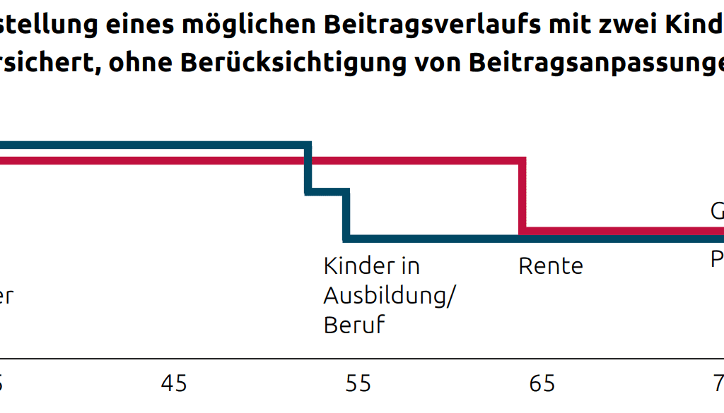 Betrachtet man den GKV-Beitrag und den Beitrag eines vergleichbaren PKV-Versicherungsschutzes über die gesamte Lebenszeit eines Versicherten, zeigt sich: Die Beitragsbelastung in der PKV – inklusive der Beiträge für Kinder – ist häufig sogar niedriger als in der GKV, vor allem dann, wenn beide Ehepartner dauerhaft berufstätig sind. Ein privater Versicherungsschutz ist damit auch für Familien eine echte Alternative.