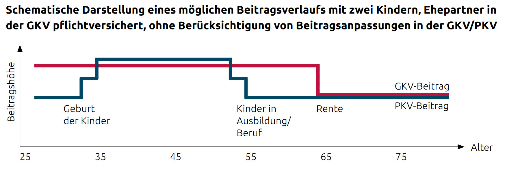Betrachtet man den GKV-Beitrag und den Beitrag eines vergleichbaren PKV-Versicherungsschutzes über die gesamte Lebenszeit eines Versicherten, zeigt sich: Die Beitragsbelastung in der PKV – inklusive der Beiträge für Kinder – ist häufig sogar niedriger als in der GKV, vor allem dann, wenn beide Ehepartner dauerhaft berufstätig sind. Ein privater Versicherungsschutz ist damit auch für Familien eine echte Alternative.